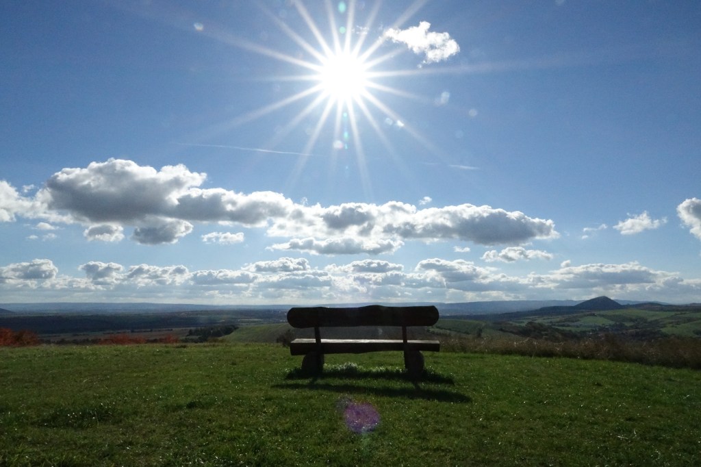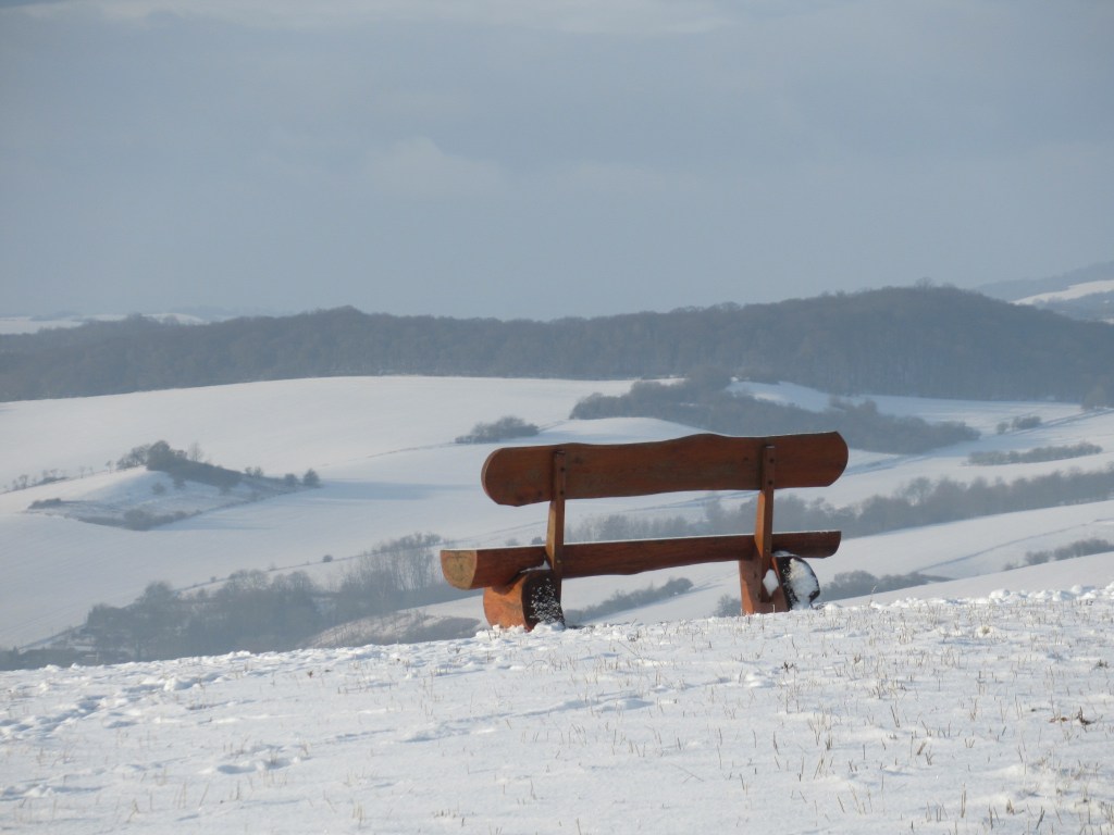 Es war da dieses eine Jahr, in dem genug Schnee fiel, der es zuließ, dass ich mit meinen Langlaufski von meinem Heimatdorf über die Äcker ganz nach oben lief. Dort genoß ich es, in die Weite zu blicken, spürte aber, ich wollte weiter. Es ging durch ein kleines Tal, dann auf eine Wiese. Dort sah ich etwas in der Ferne, konnte aber nicht erkennen, was genau es war. Beim Näherkommen zeigte sie sich mir zum ersten Mal – die Gedankenbank … wunderschön gelegen mit einem Rundumblick auf die Harzer Mischwälder, die Streuobstwiesen, die Erhebungen des Kyffhäusergebirges bis hin zu den Ausläufern des Thüringer Waldes. Das erste Foto von der Gedankenbank im Winter war etwas Besonderes, darauf wurde ich auch öfter angesprochen 😉 .